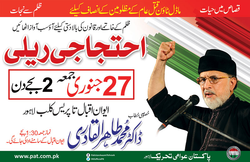 Dr Tahir-ul-Qadri said that we have decided to hold a protest for justice in Model Town case on January 27 in Lahore. He further said that 17 SHOs, 7 SPs and 1 DIG were present at the time of operation in the Model Town. He demanded that all masterminds should be summoned and held accountable for their role in the tragedy. He said that the second and third round of Qisas are left and we will not compromise on our demand for justice.